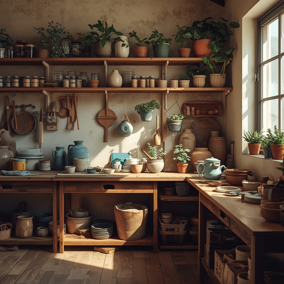 Wooden tables, linen backdrops, and muted plaster walls highlight the raw character of ceramics. Avoid shiny or synthetic materials that break the organic rhythm.