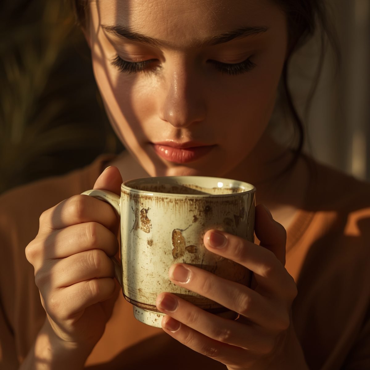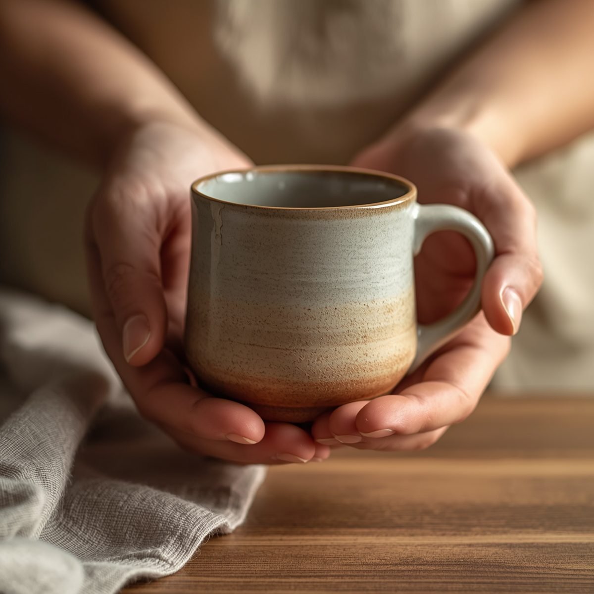 A mug “in the hands” gives viewers a sense of scale and warmth.