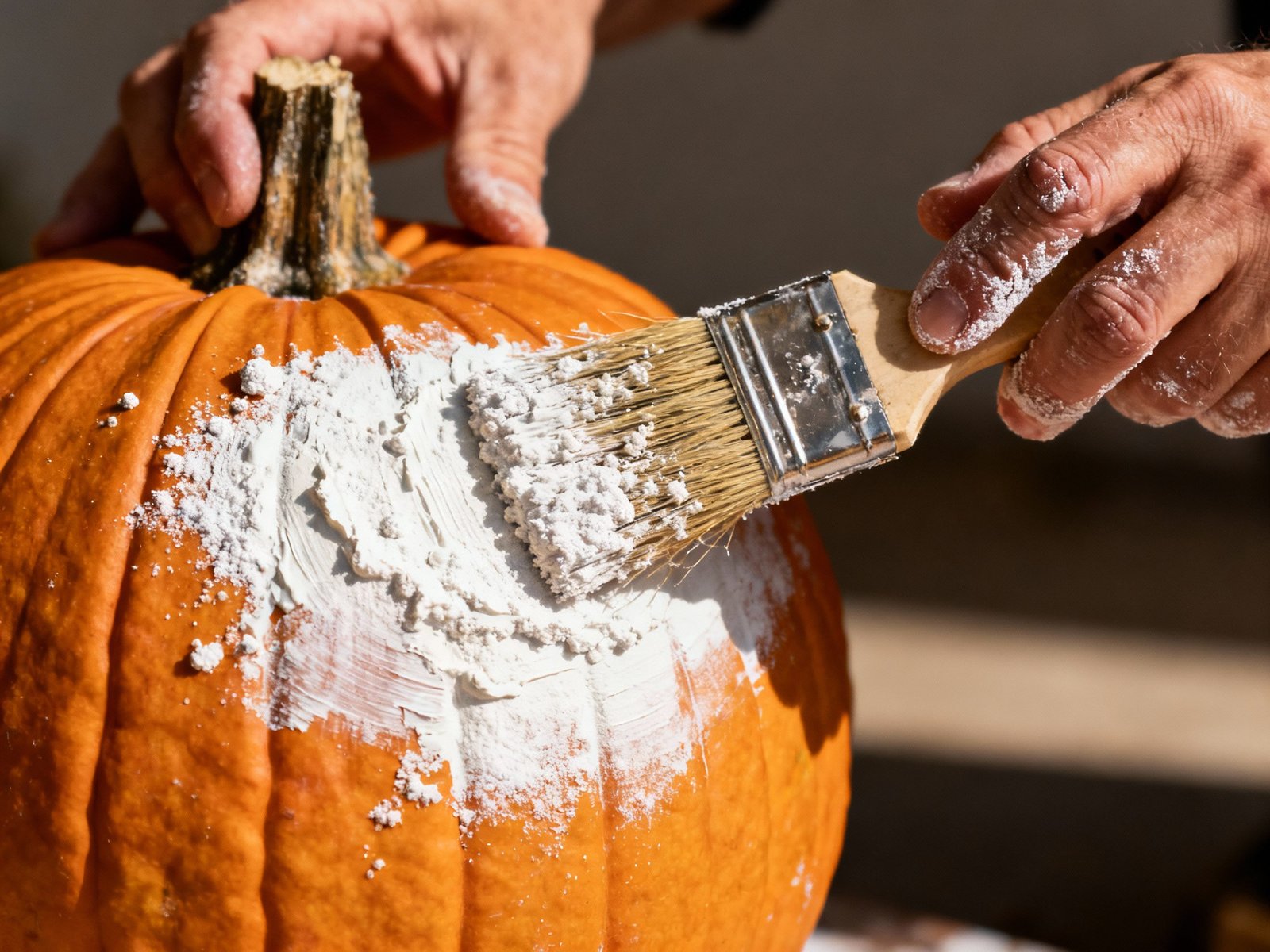 Using your stiff chip brush, start applying the paint mixture all over the pumpkin.