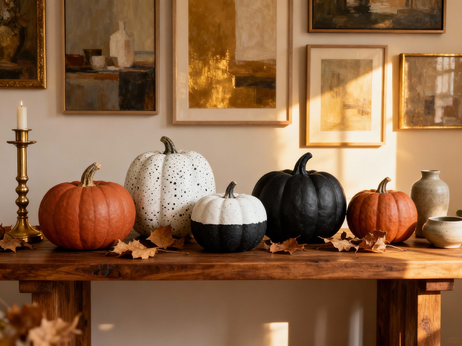 How-To: On your dry, sealed base (a matte white or beige pumpkin works best), dip a small, stiff brush (an old toothbrush is perfect) into matte black paint. Point the brush towards your pumpkin and use your thumb to flick the bristles. This creates a fine, artistic splatter. Less is more!