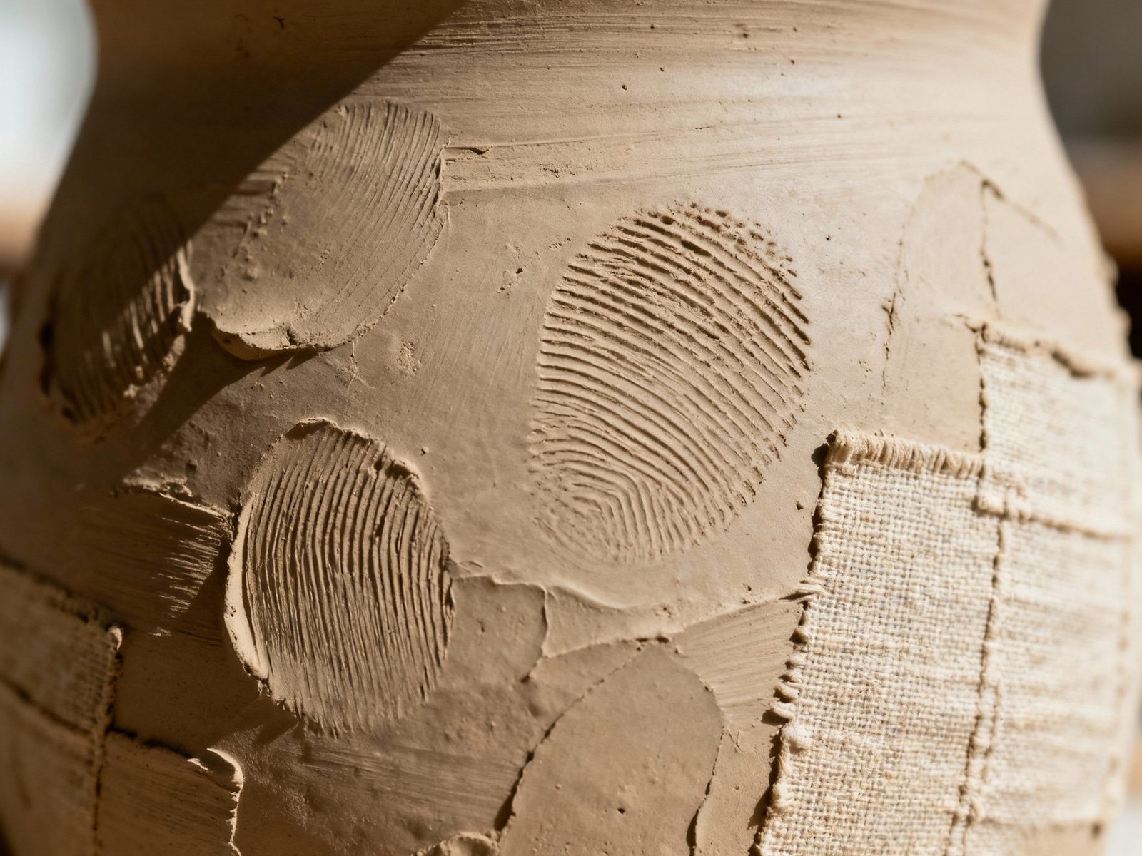 Rough brushing, fingerprint marks, clay scratching, and pressing natural materials (like linen or leaves) into clay give pieces raw emotional texture.