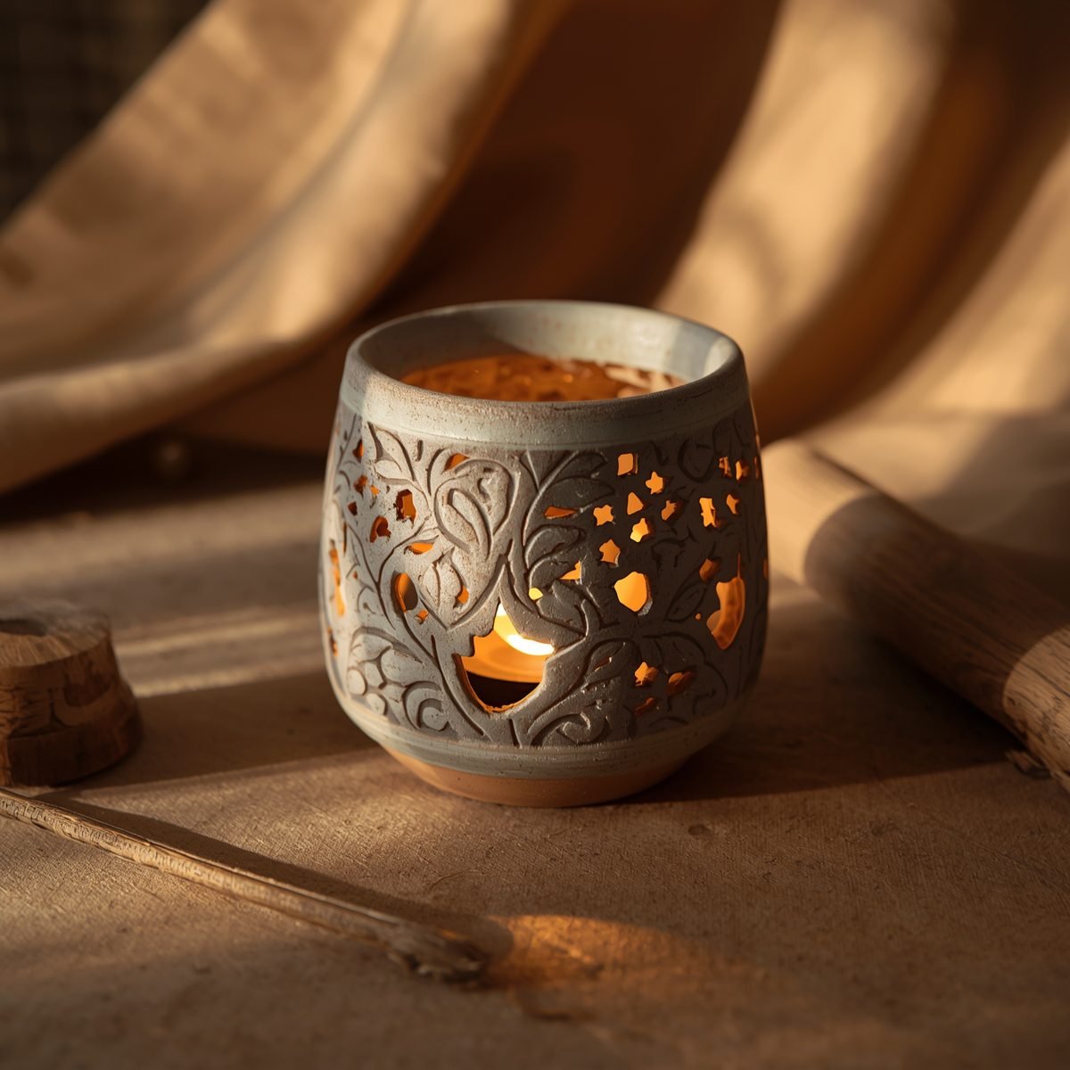 There’s something magical about the way flame interacts with clay. Ceramic surfaces absorb and reflect light in ways no synthetic material can replicate. A handmade candle holder glows with character — its textures casting subtle shadows on nearby walls. An oil warmer diffuses scent gently, creating an emotional atmosphere tied to comfort and calm.