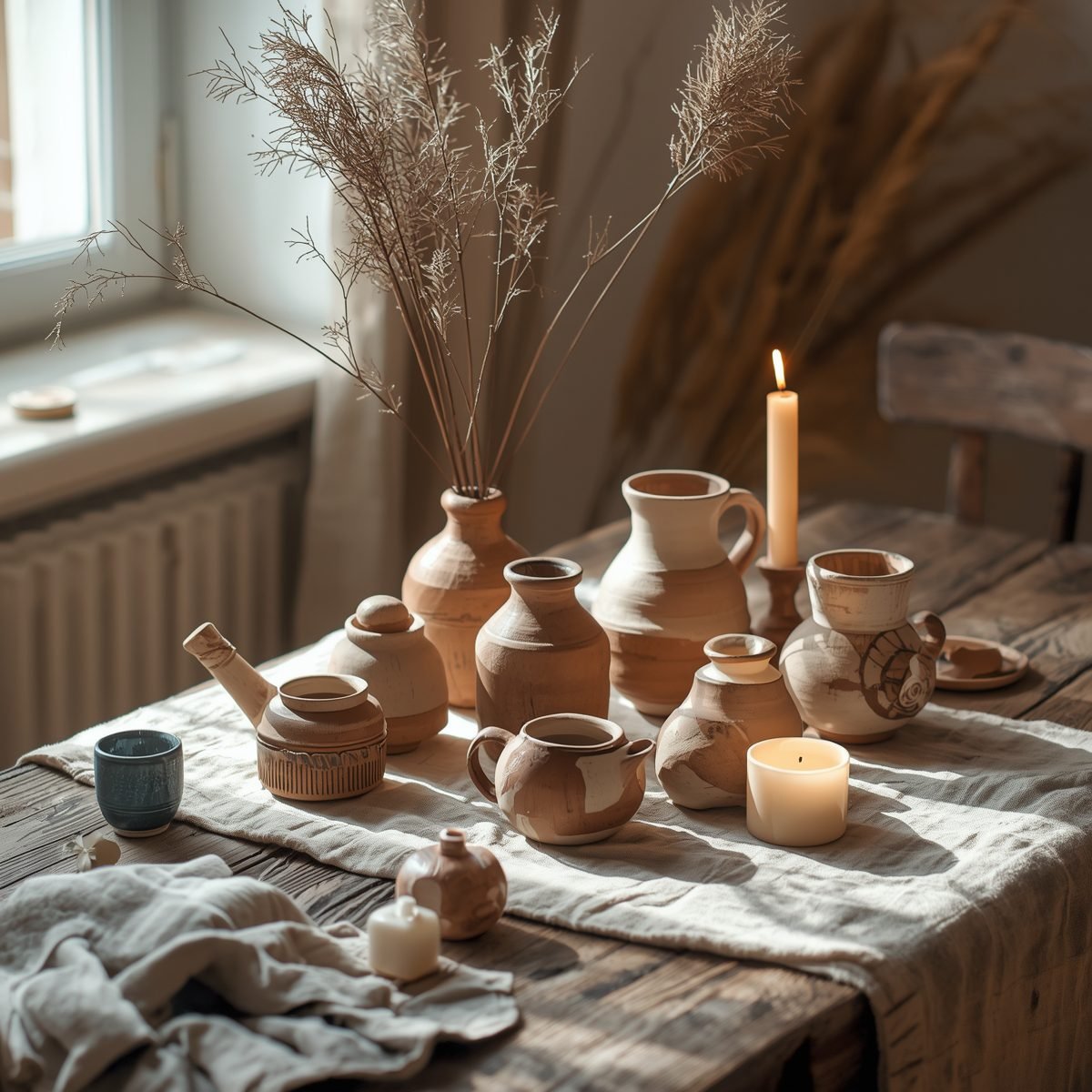 Wood, linen, stone, and neutral surfaces bring out the organic nature of clay.